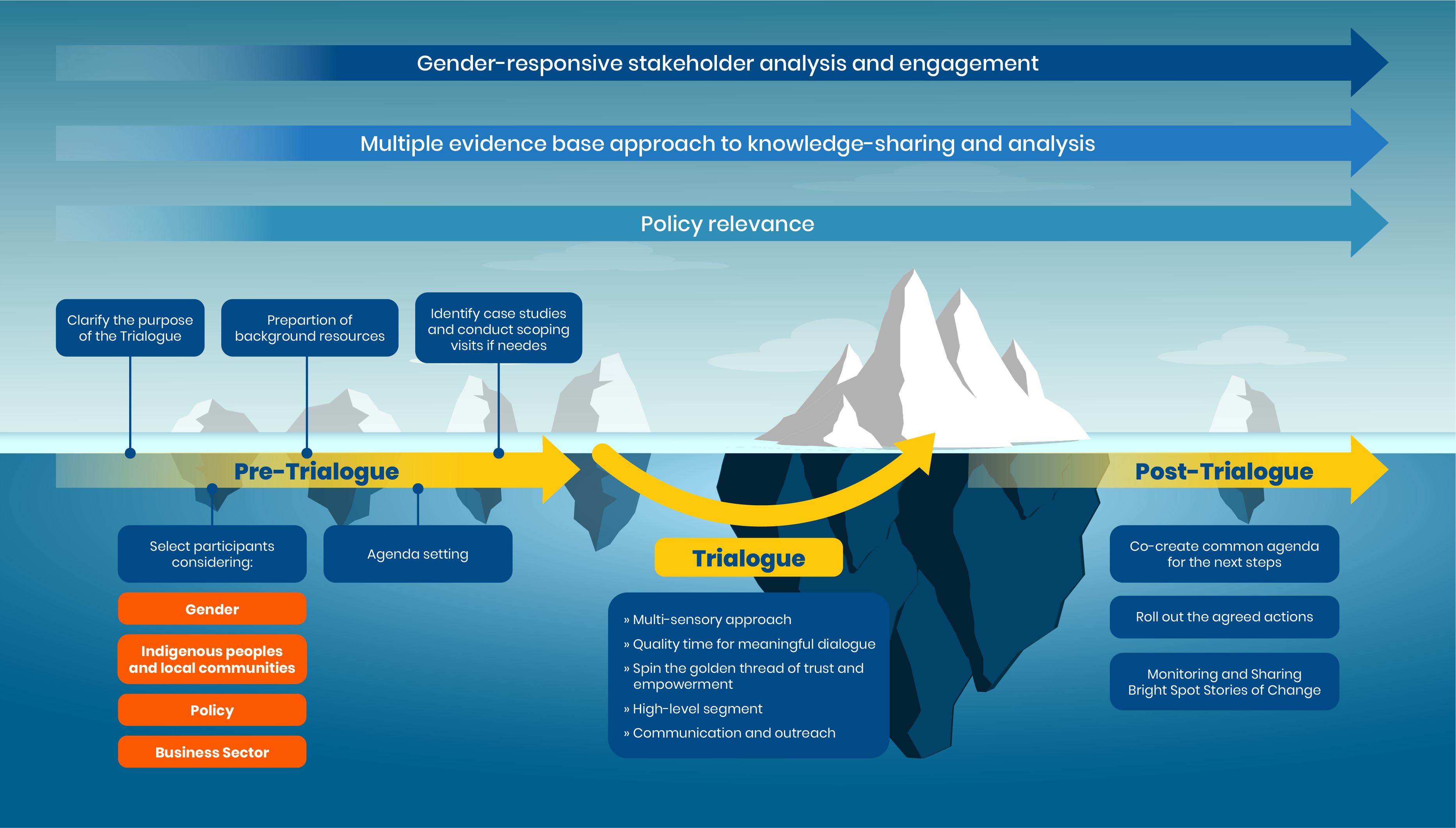 The iceberg metaphor acts as an analogy to the stakeholder engagement approach applied during the Trialogue event.