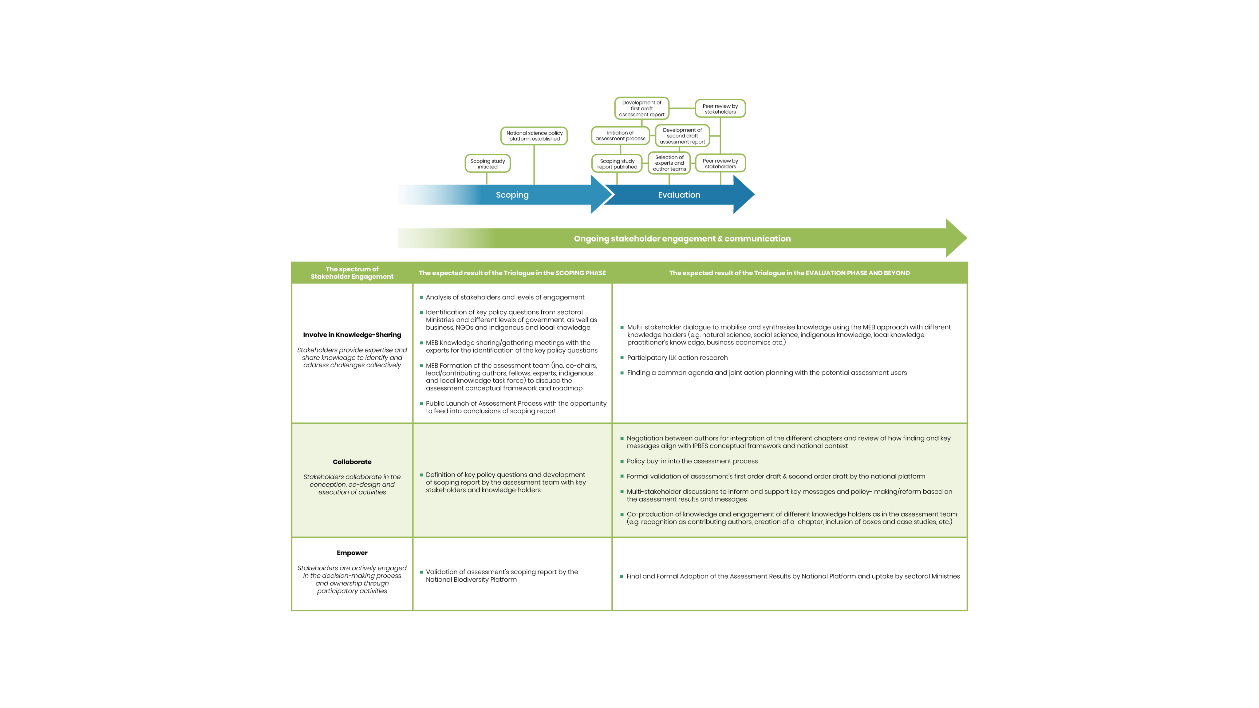 The Trialogue can take place at any stage of the assessment. It is useful to consider Trialogues as a stakeholder engagement methodology from the onset of an assessment and revisit its need and relevance throughout the assessment, particularly at the start of each stage (Scoping, Evaluation, Validation/Approval). It is also important to be mindful of the different stakeholders and the knowledge holders’ context, needs, interests and influence.
